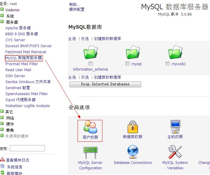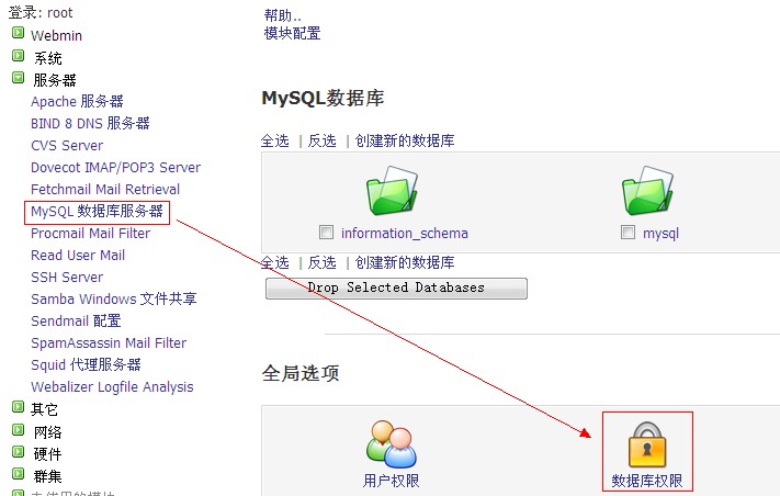 f、點(diǎn)擊“服務(wù)器”—“mysql數(shù)據(jù)庫服務(wù)器”—“數(shù)據(jù)庫權(quán)限”,如圖: