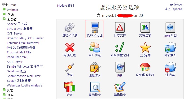 d、 如果有多個(gè)域名需要綁定,請(qǐng)點(diǎn)擊“虛報(bào)主機(jī)列表”選擇您的虛擬主機(jī),進(jìn)入虛擬主機(jī)服務(wù)器選項(xiàng),點(diǎn)擊“網(wǎng)絡(luò)和地址”如圖: