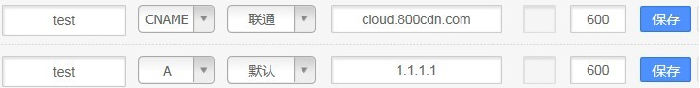 默認(rèn)使用A記錄都直接解析到獨(dú)立IP地址;聯(lián)通使用cname記錄解析到cloud.800cdn.com